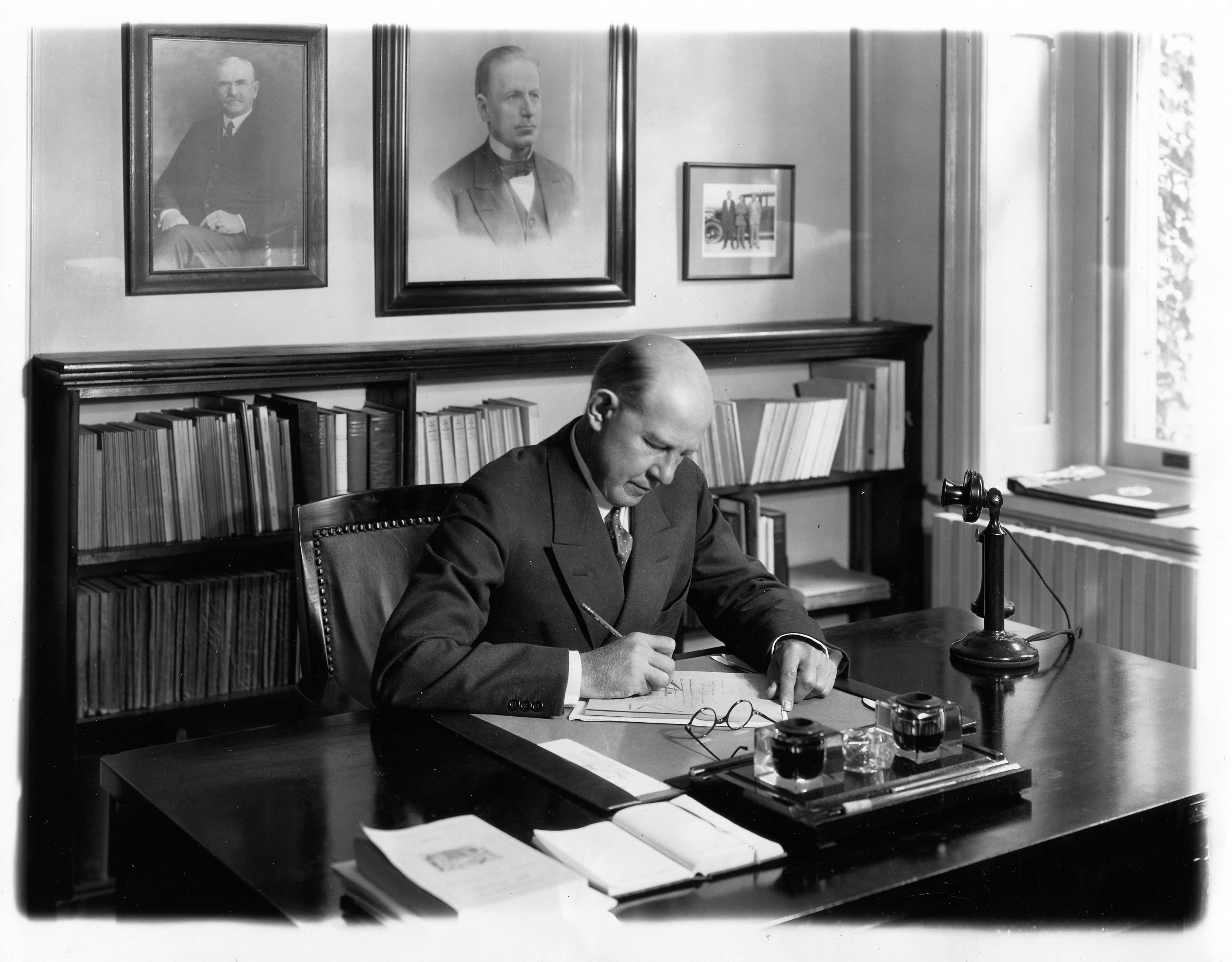 Frank Aydelotte, seated at his desk at Swarthmore College.