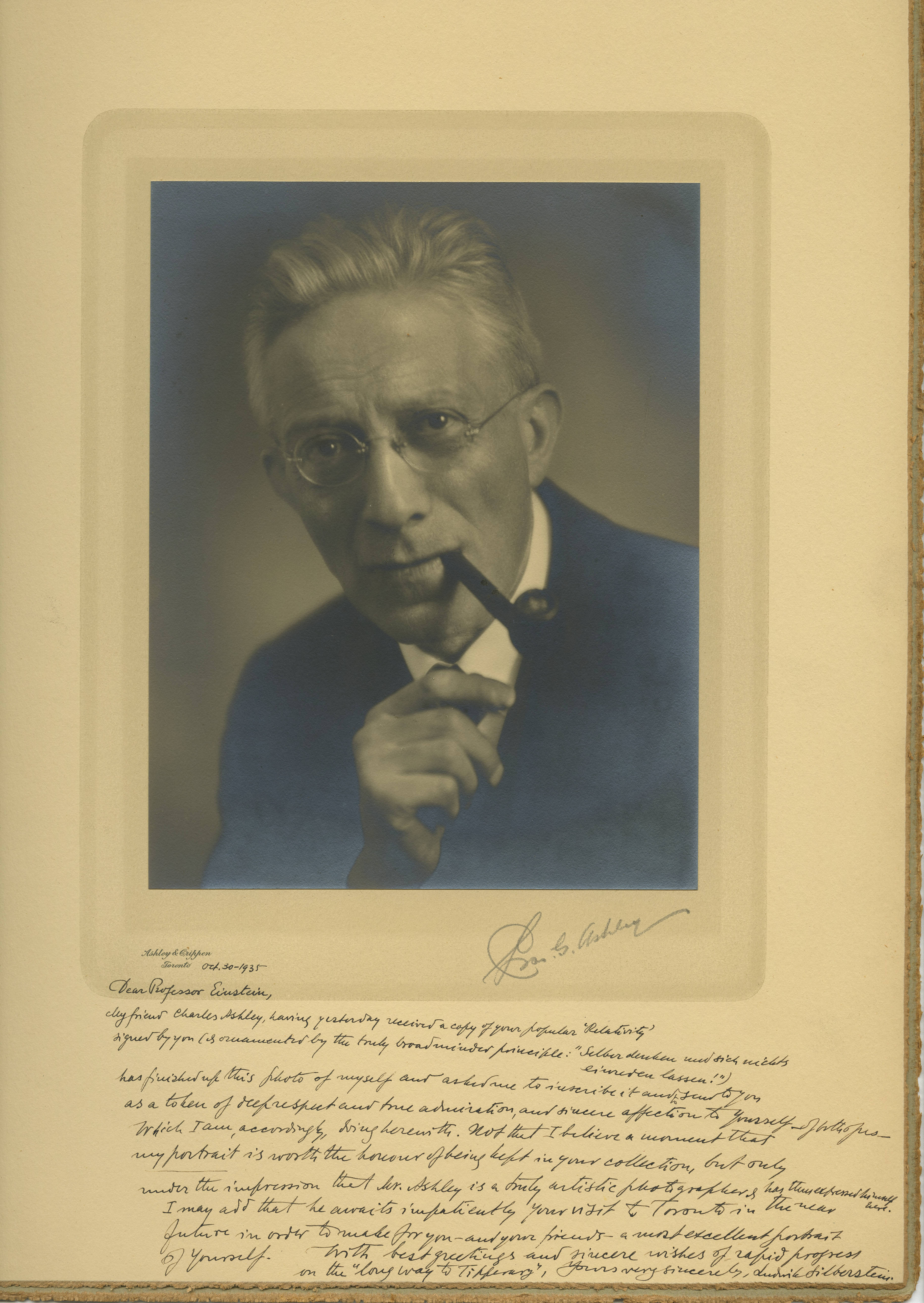 This formal portrait of physicist Ludwik Silberstein, who publicly expressed doubt regarding aspects of Einstein's theories, is adhered inside a paperboard portfolio frame, which is signed in pencil by the photographer in the lower left. The exterior of the portfolio is imprinted: "Ashley and Crippen, Photographs, Toronto, Can.," and inscribed in ink: "To Professor Albert Einstein, most respectfully dedicated by Ludwik Silberstein (the object). Chas. G. Ashley (the recorder), Toronto, Oct. 30, 1935. " The interior is inscribed in ink from Silberstein to Einstein with the text: "Oct. 30-1935, Dear Professor Einstein, My friend Charles Ashley, having yesterday received a copy of your popular "Relativity" signed by you (& ornamented by the truly broadminded principle: "Selber denken und sich nichts einreden lassen!) has finished up this photo of myself and asked me to inscribe it and to send to you as a token of our respect and true admiration, and sincere affection to yourself-of both of us-Which I am, accordingly, doing herewith. Not that I believe a moment that my portrait is worth the honour of being left in your collection, but only under the impression that Mr. Ashley is a truly artistic photographer & has thus expressed himself here. I may add that he awaits impatiently your visit to Toronto in the near future in order to make for you-and your friends-a most excellent portrait of yourself. With best greetings and sincere wishes of rapid progress on the "long way to Tipperary", Yours very sincerely, Ludwik Silberstein."