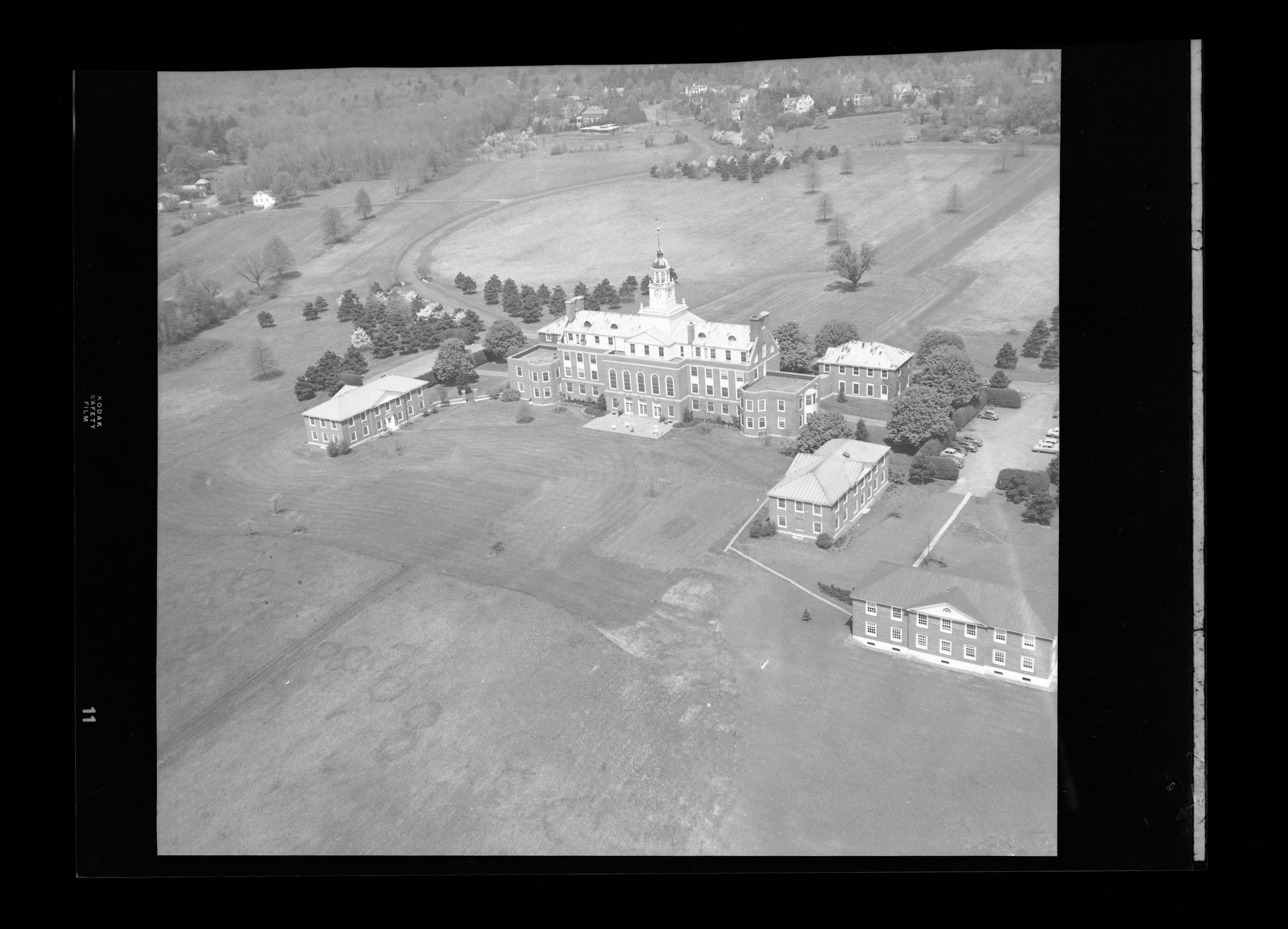 At the time that this photograph was taken, the academic builidngs on the Institute campus consisted of Fuld Hall with its adjacent Buildings A and B as well as the smaller, freestanding Buildings C, D, and E. Of these, the last to be constucted was Building E in 1953. Buildings C and E would later be incorporated into the larger structure known as Bloomberg Hall (2002) that is the home of the Institute's School of Natural Sciences.